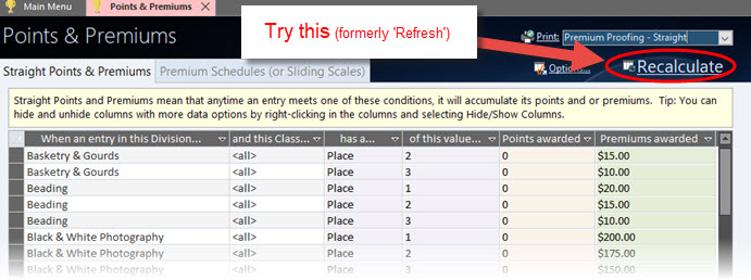 Click the "Recalculate" (formerly labeled "Refresh" in versions prior to ShoWorks 2020) button before closing the Points & Premiums menu if you