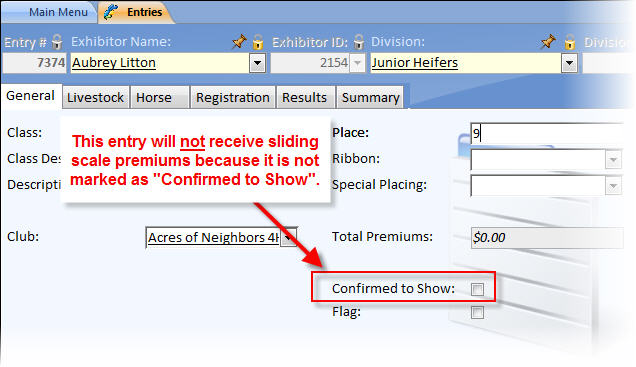 will not receive a premium because it does not match having the Sub-Class value of "Youth". Either change the premium rule's Sub-Class value to "<all>" or change the entrie's Sub-Class value to "Youth". If the Sub-Class field is not visible, right-click in any record and choose "Hide/Show Columns" or if this is not available, click the Customize Layout link in the lower left and make the field visible.