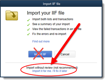 - For QuickBooks 2018 and older, click the "Import IIF" button. For QuickBooks 2019 and newer, do not click the "Import IIF", but instead click "Import it for me. I'll fix it later" link at the bottom of the Window: