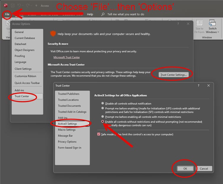 Check and change (if needed) the Trust Center settings in Microsoft Access to enable ActiveX components to function.