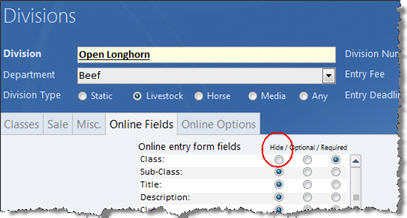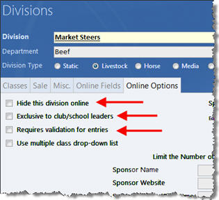 Requires validation for entries – used to hide the division until an exhibitor first logs on to the website and this exhibitor has already entered prior entries in this division and those entries have also been uploaded. See the help article on "Using Validation or Nominations to control the online entry process".
