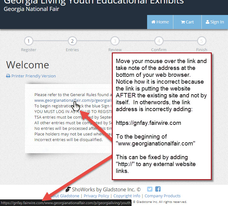 Check web link by mousing over the link from the website and make sure that the address does not prepend the ShoWorks online entries website at the beginning of the link. See the following solution below.