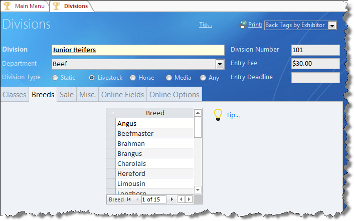 Breeds can now be preloaded and stored and managed across multiple divisions, allow drop-down selection at data entry both locally, online, and on the iPad.