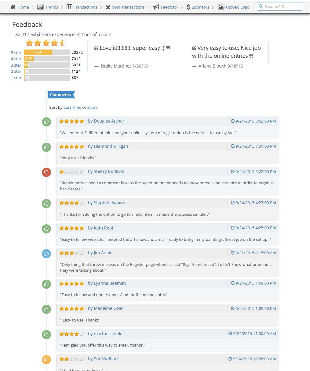 Stay on top of what your exhibitors say about your fair experience. Similar to Amazon ratings (5 star with comments).
