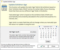 In seconds, automatically adjusts the Age of all exhibitors based on a target date and the exhibitor's birth date, eliminating the need to ask or specify an age that an exhibitor will be on a certain date.