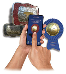 Give your exhibitors something special, at no cost to the fair. Now digital but very realistic 3D ribbons, belt buckles and trophies are automatically issued to exhibitors to keep as memorable tokens on their iPhone or Android mobile device. Each award is customized with your fair name, their own name, a description of their entry, the year won, and kind of award. Artificial intelligence automatically determines the type of entry among 42 different global standardized types like cattle, hogs, flowers, needlework, photography, etc. so that for example, a Grand Champion Market Steer exhibitor will receive a customized virtual belt buckle with a steer engraved in gold. A blue ribbon quilt exhibitor will receive a virtual blue ribbon with a symbol of a quilt engraved on the front and their information on the back of the ribbon. The exhibitor can even spin the award around to 'feel' the realistic award.