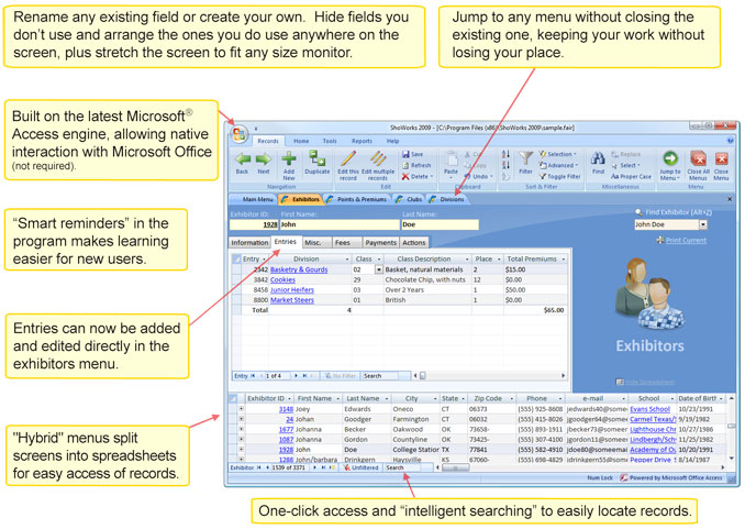 - Intelligent searching. Now, a generic search box where as you type, ShoWorks narrows down the records on "every" field. For example, start typing "Cal" and ShoWorks narrows records down to those including Calvin as a first name, Calhoun as a last name, Calgary as a city, Callamazoo High School as a school... Just keep typing and the more you type, the narrower the results get. Type in 307 and records are narrowed down with 307 as an Entry Number, 307 as an Exhibitor Number, 307 as an area code...and you get the idea.
